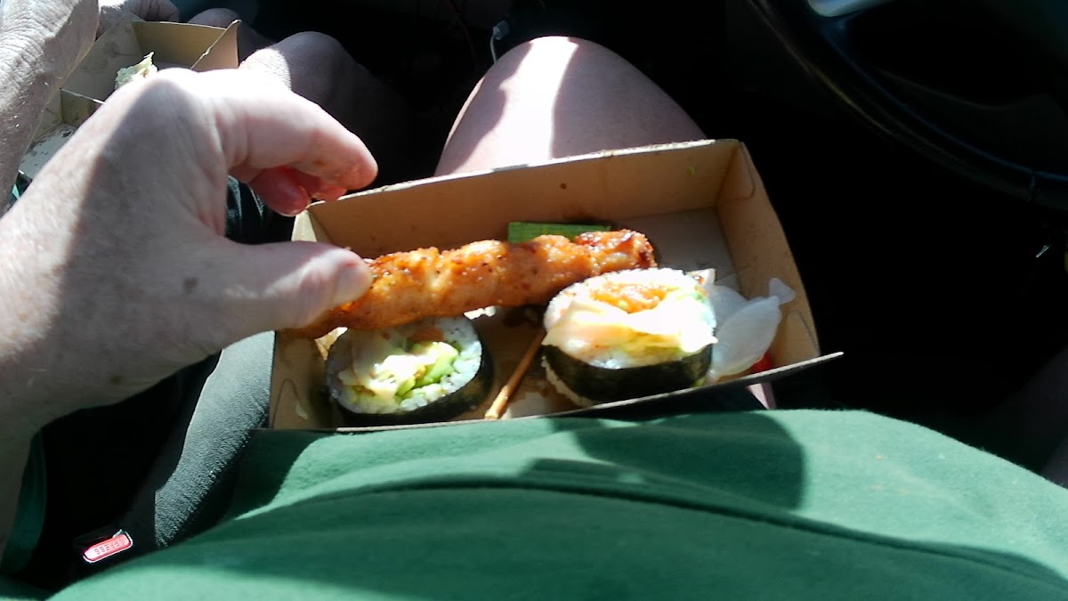 Now a shopping fixture. Spend loads at Okara stores then a takeaway lunch of very yummy sushi. Blow flies wandering about in the display cabinet put us off buying from the other one down the drive but this place always clean and tidy. I like the idea odd being able to add extra soy.